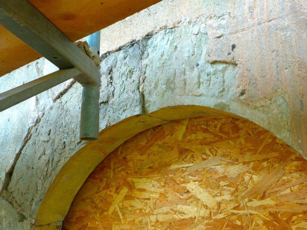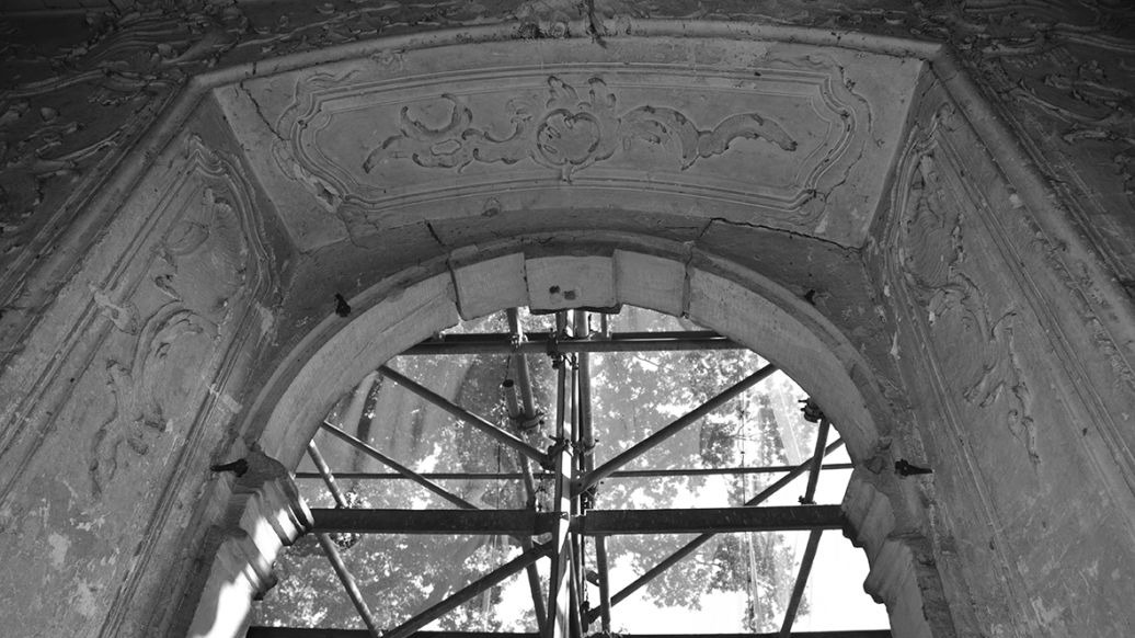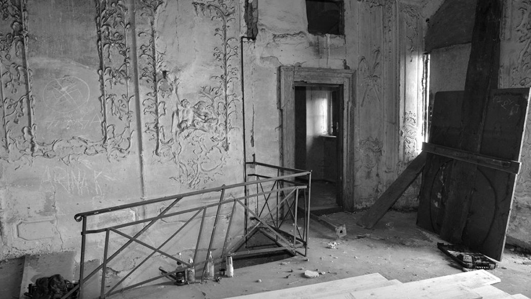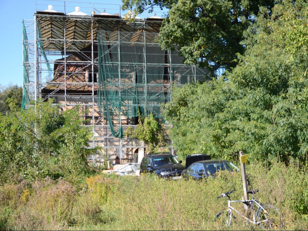 Trotz Notsicherungsmaßnahmen – eine Zeitlang war das ganze Gebäude in Plastik eingehaust - verschafften sich immer wieder Eindringlinge Zugang ins Schlösschen und verheizten z.B. die Treppe und zerstörten Deckengemälde.