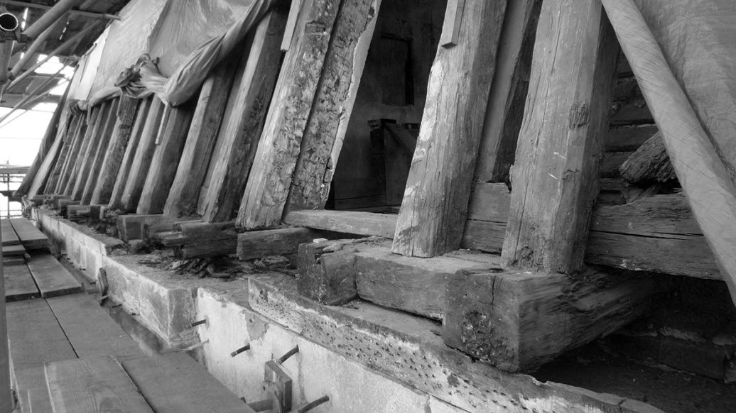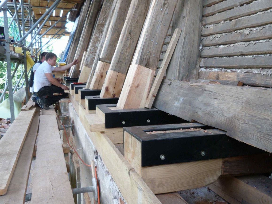 Risse in der Fassade, statisch bedenkliche Setzungen, ein undichtes Dach, ein stark mitgenommenes Dachtragwerk, Schäden und Verluste der reichen Stuckausstattung, fehlende Fußböden, Türen, Fenster. Alles musste gesichert, instandbesetzt, saniert, zum Teil ergänzt werden. Überall wurde akribisch versucht die Sanierungen in denkmalgerechter und handwerkstypischer Baukunst durchzuführen. Handwerk hat gerade bei Sanierungen „goldenen Boden".